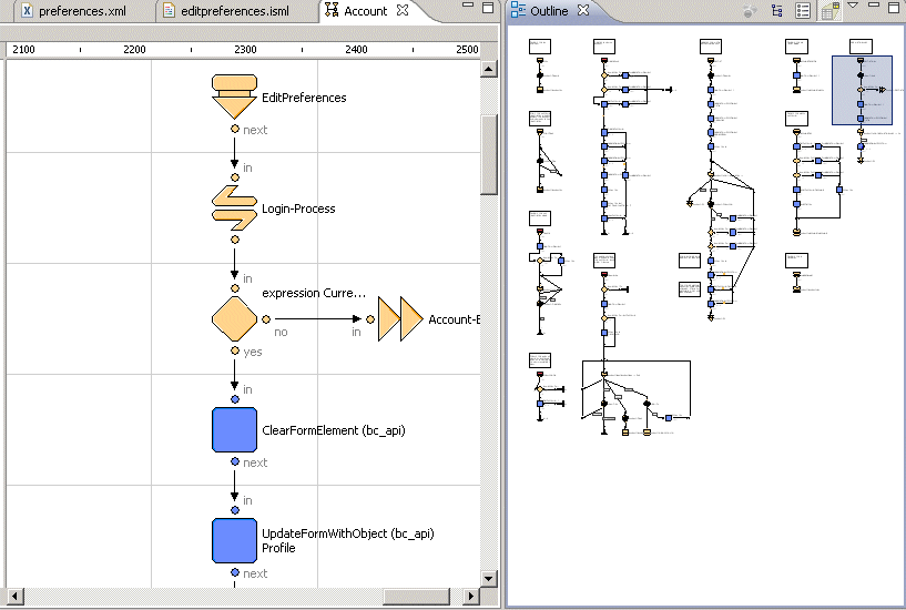 The final Jump node of the Account-EditPreferences subpipeline returns to the Account-Show subpipeline to continue processing the Account-EditPreferences subpipeline from the accountlanding content asset, which is called by the Account-Show subpipeline.