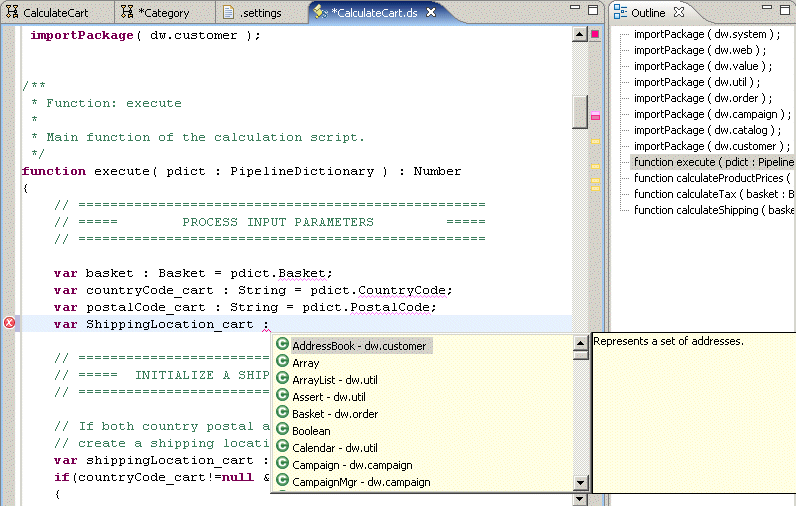 Salesforce B2C Commerce's script file editor provides syntax highlighting, code completion and code checking.