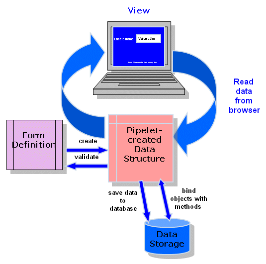 When the data structure is populated (via a pipelet), it can be acted upon (controller) by the various components of the affected pipeline (template, form-specific pipelet or script) to render the data on a browser (view) or save it to a database.