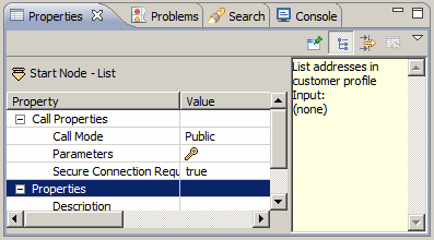 The Properties view is where you can view and set properties for templates, scripts, pipelines and pipelets. In this area you can also view the Problems log and Console.