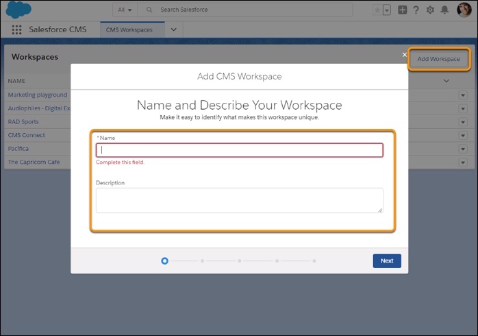 For information about creating CMS workspaces, see Create a CMS Workspace in Salesforce CMS.
