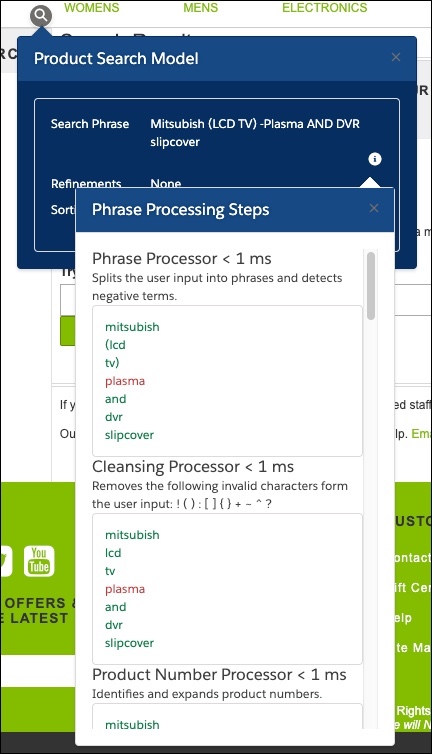 Click the information icon next to the Search Phrase field on the Product Search Model window to see the Phrase Processing Steps window.