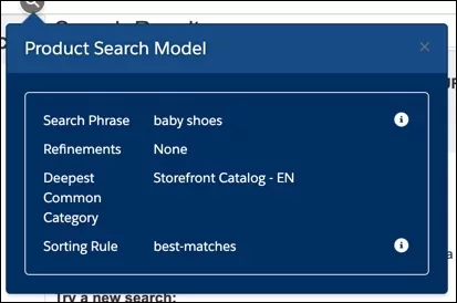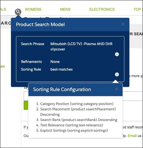 Click the information icon next to the Sorting Rule field on the Product Search Model window to see the Sorting Rule Configuration window. Any sorting rules based on attributes list both the attribute name and ID. In this example, the best-matches rule for the search result listed in the Search Query window has five sorting rules: Category Position, Search Placement Descending, Search Rank, Text Relevance, and Explicit Sortings.
